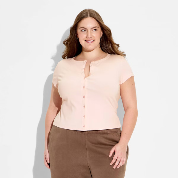 Wild Fable Women's Cap Sleeve Round Neck Button-Down Shirt, 2X - Pink