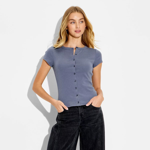 Wild Fable Cap Sleeve Round Neck Button-Down Shirt, L - Dark Blue