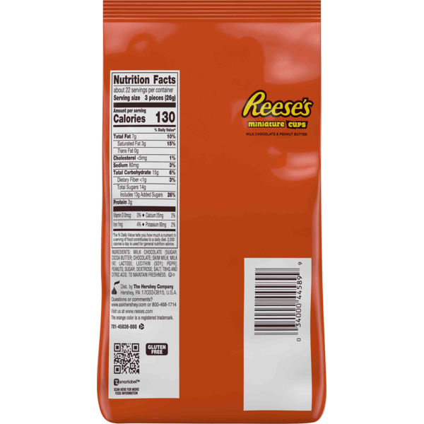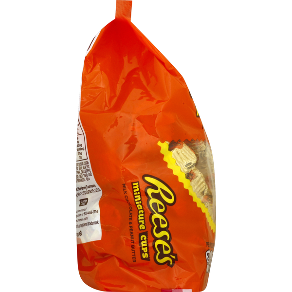 Front of Candy & Chocolate Reese's Milk Chocolate & Peanut Butter, Miniature, Cups, Family Bag