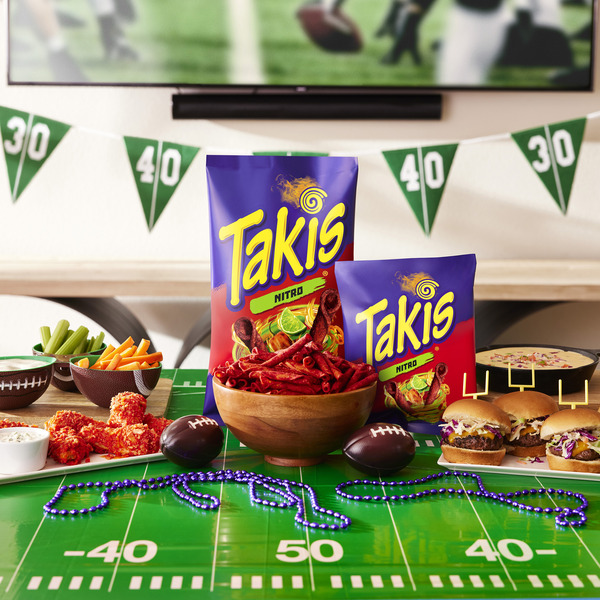 Front of Chips & Pretzels Takis Nitro 9.9 oz Sharing Size Bag, Habanero & Lime Flavored Extreme Spicy Rolled Tortilla Chips