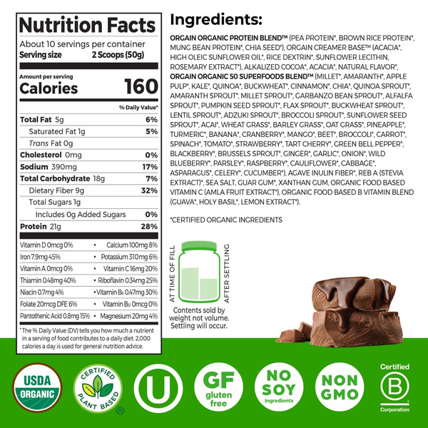 Orgain Organic Vegan 21g Protein Powder + 50 Superfoods, Creamy Chocolate Fudge