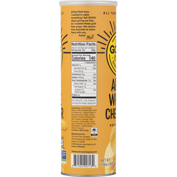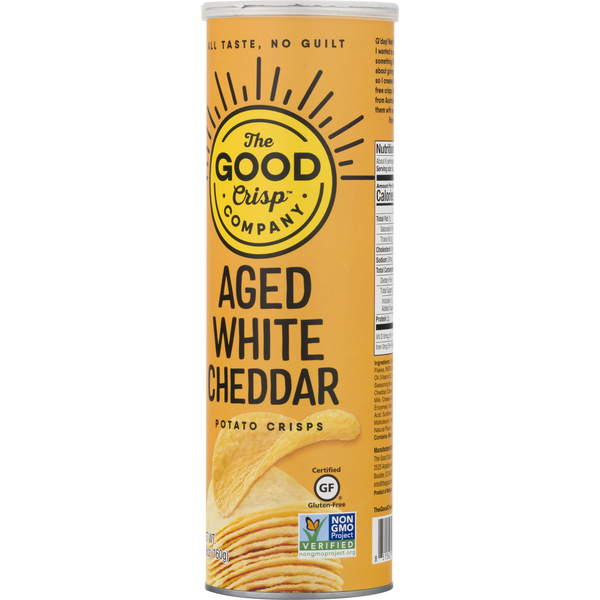 Front of Chips & Pretzels The Good Crisp Company Potato Crisps, Gluten Free, Aged White Cheddar