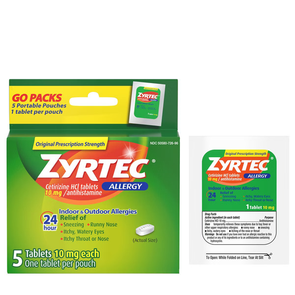 ZYRTEC 24 Hour Allergy Relief Tablets, Indoor & Outdoor Allergy Medicine with 10 mg Cetirizine HCl per Antihistamine Tablet, On-the-Go Relief, Individual Travel Pouches, 5 ct, (5 x 1 ct)