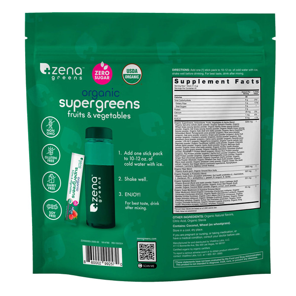 Zena USDA Organic Supergreens Fruits & Vegetables Powder, 45 Stick Packets