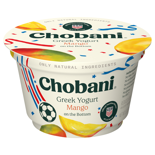 Front of Yogurt Chobani Reduced Fat Greek Mango on the Bottom Yogurt