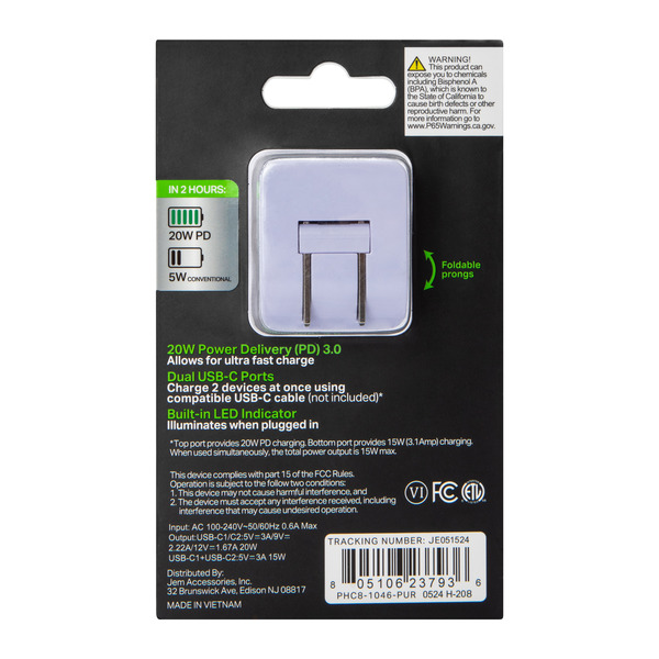 Front of phone cables & chargers Five Below 20W Power Delivery Dual USB-C Charger - Purple