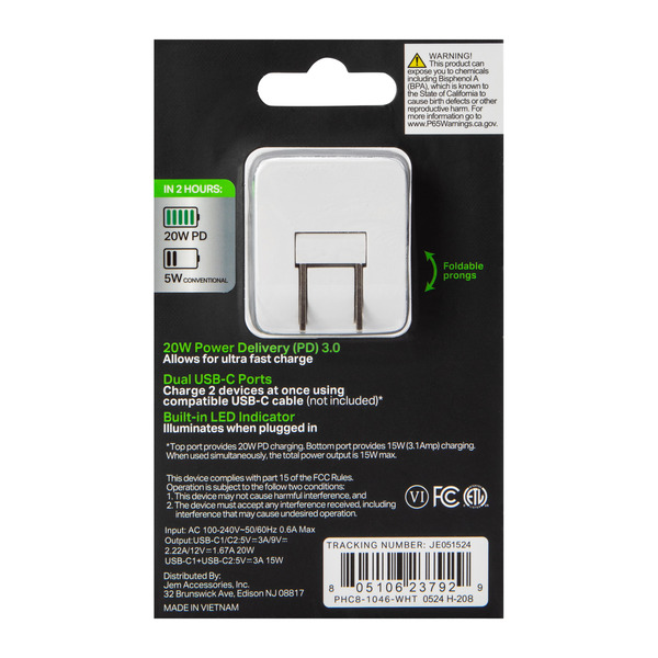 Five Below 20W Power Delivery Dual USB-C Charger, Large - White