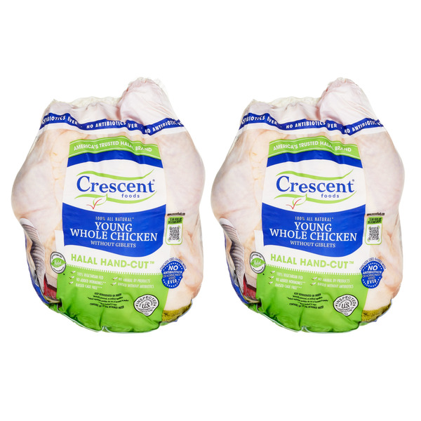 Crescent Foods Halal Young Whole Chicken without Giblets, Hand-Cut, 3 lbs, 2 ct
