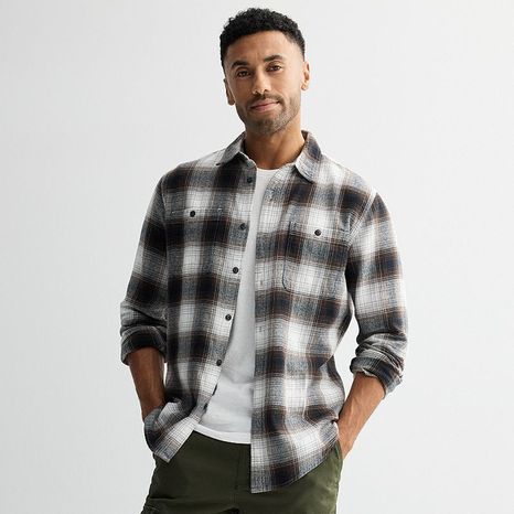 Sonoma Goods For Life® Long Sleeve Brushed Flannel Shirt, Men's, Size: Small, Brown Grey Plaid