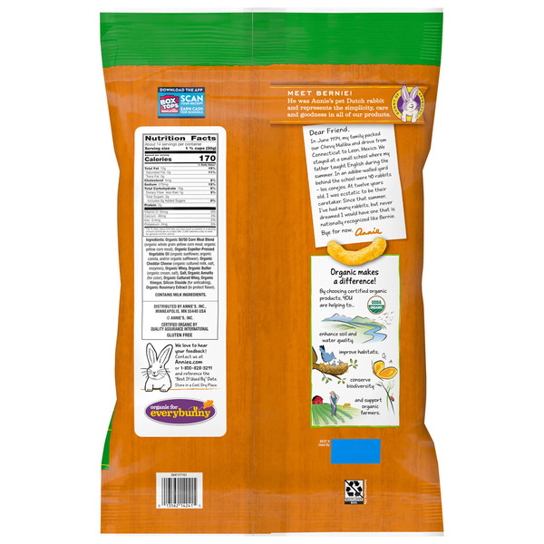 Front of Chips & Pretzels Annie's Organic Extra Cheddar Cheesy Smiles Corn Puffs