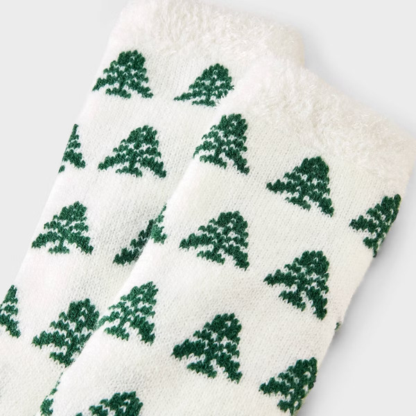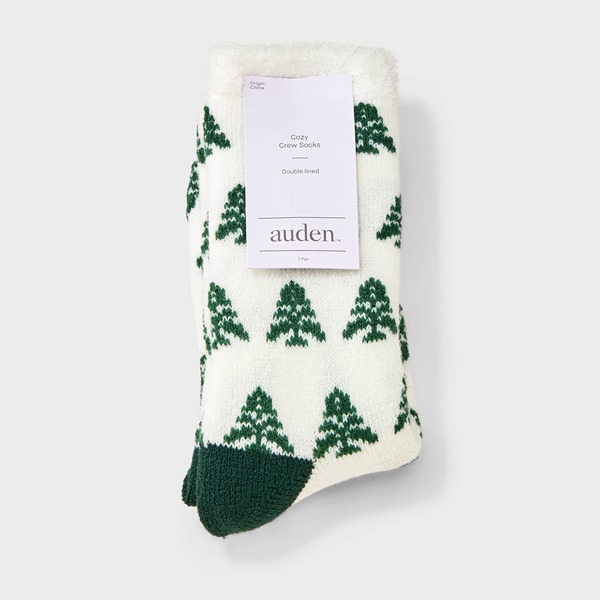 Auden Women's Evergreen Trees Christmas Double Lined Cozy Crew Socks, Size 4-10 - Ivory/Green