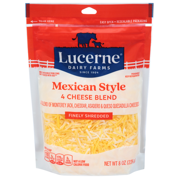 Front of Packaged Cheese Lucerne Finely Shredded Cheese, Mexican Style, 4 Cheese Blend