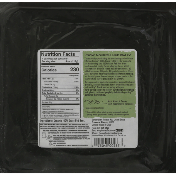 Thousand Hills Lifetime Grazed Ground Beef, 85%/15%, 100% Grass Fed