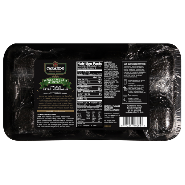 Front of Packaged Meat Carando Mozzarella Rustica Italian Style Meatballs