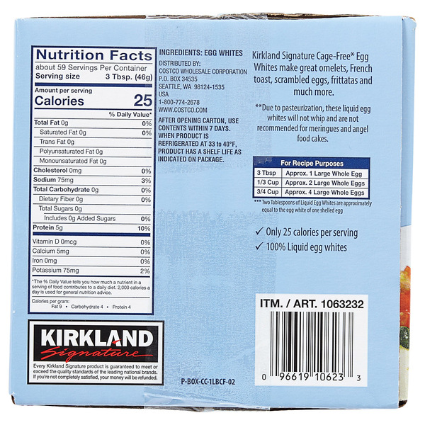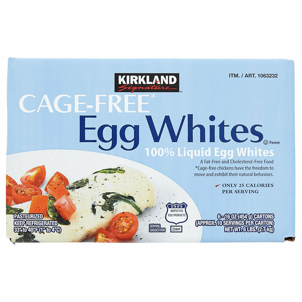 Front of Eggs Kirkland Signature Cage Free Egg Whites, 6 x 16 oz