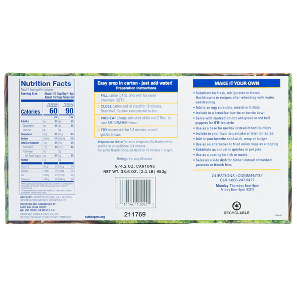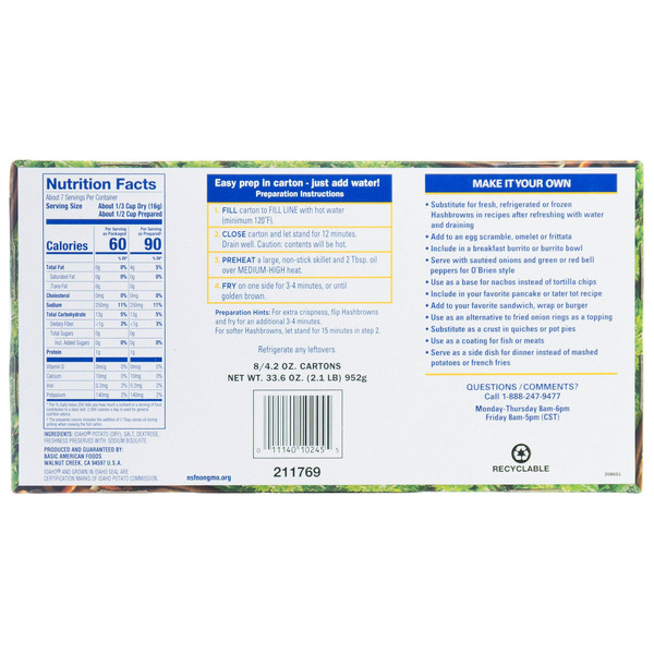 Front of Pancake and Baking Mixes Idaho Spuds Hashbrown Potatoes, 8 x 4.2 oz