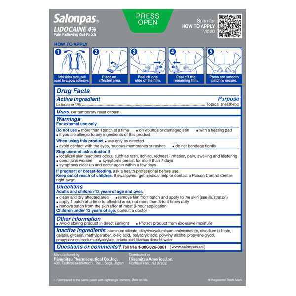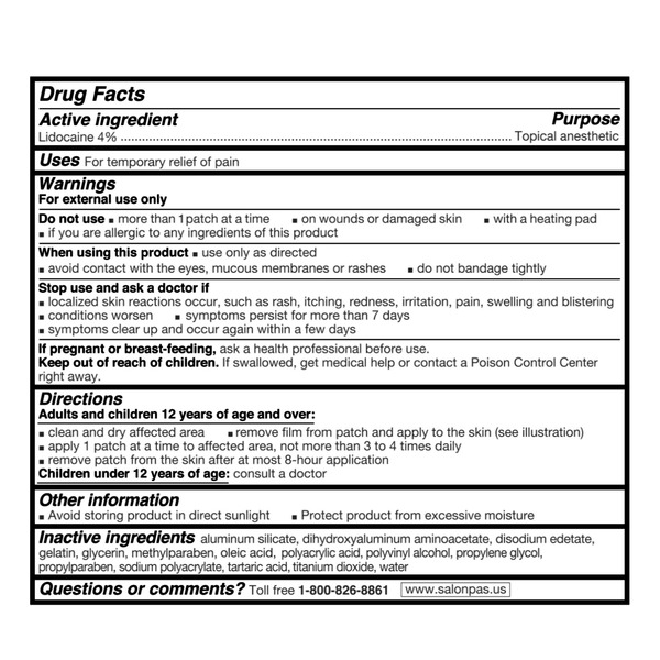 Salonpas LIDOCAINE 4% Pain Relieving Gel-Patch, 15 Patches