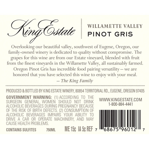 Front of White Wine King Estate Pinot Gris, Oregon, 750 ml