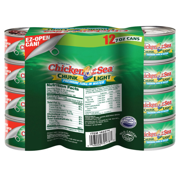 Front of Canned Fish Chicken of the Sea Chunk Light Tuna in Water, 12 x 7 oz