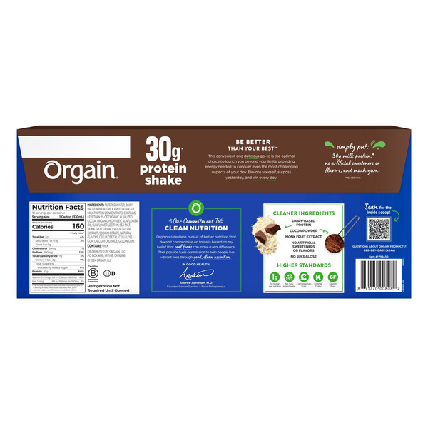 Front of Protein & Meal Replacements Orgain 30g Milk Protein Shake, Chocolate Fudge, 11 fl oz, 18-pack