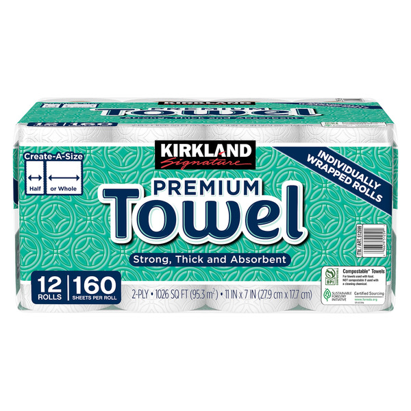Kirkland Signature Paper Towels, 2-Ply, 160 Sheets, 12 Individually Wrapped Rolls
