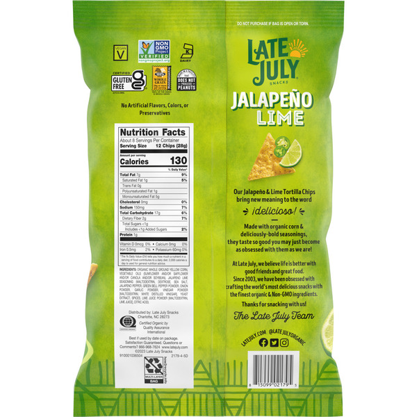 Front of Chips & Pretzels Late July Jalapeno Lime Tortilla Chips