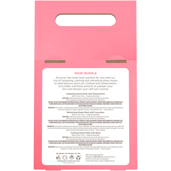 Front of Burt's Bees Sheet Mask Bundle, Hydrating Watermelon, Calming Rose, Refreshing Cucumber; 99% Natural Origin, Single Use