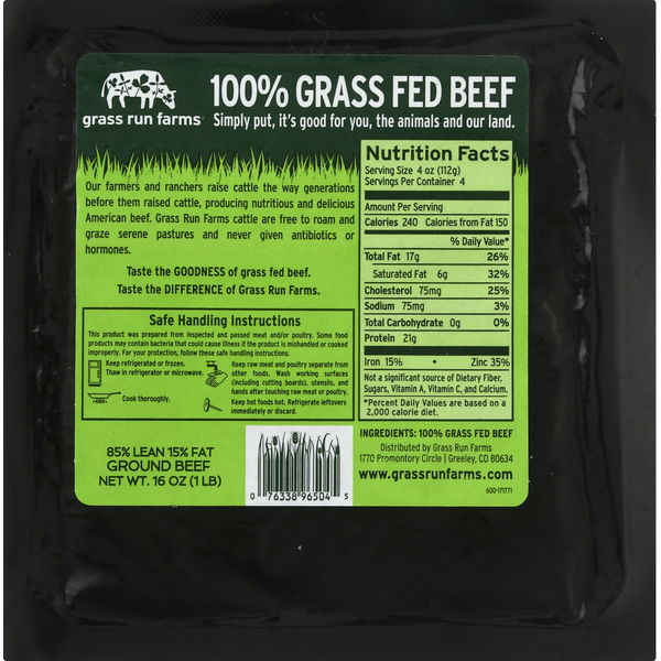 Front of Packaged Meat Grass Run Farms Beef, Ground, 85%/15%