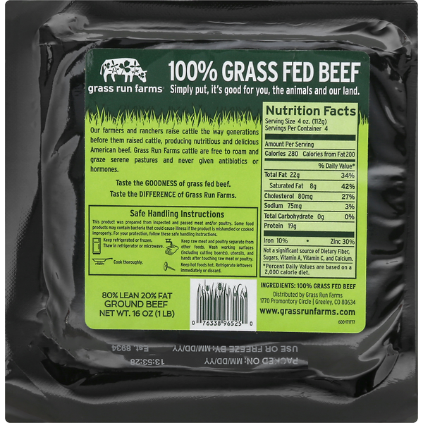 Front of Prepared Meals Grass Run Farms Beef, Ground, 80/20
