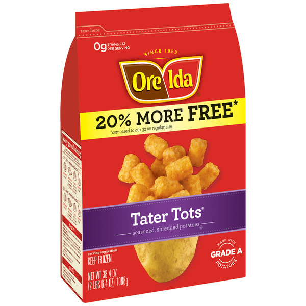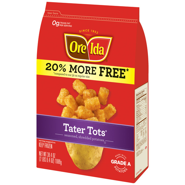 Front of Frozen Meals Ore-Ida Tater Tots Seasoned Shredded Potatoes Frozen Food Snacks