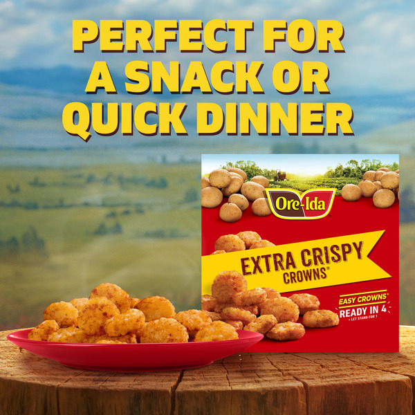 Front of Frozen Meals Ore-Ida Ready in 5 Extra Crispy Crowns Seasoned Shredded Microwavable Potatoes
