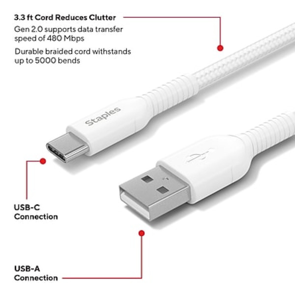 Staples TECH USB-C to USB-A Charging Cable - White
