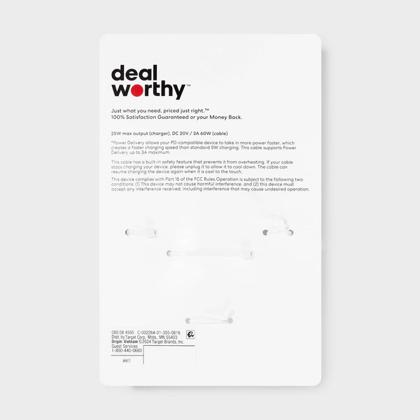 Dealworthy 2-Port 25Watt Wall Charger With USB-C to USB-C Cable - White